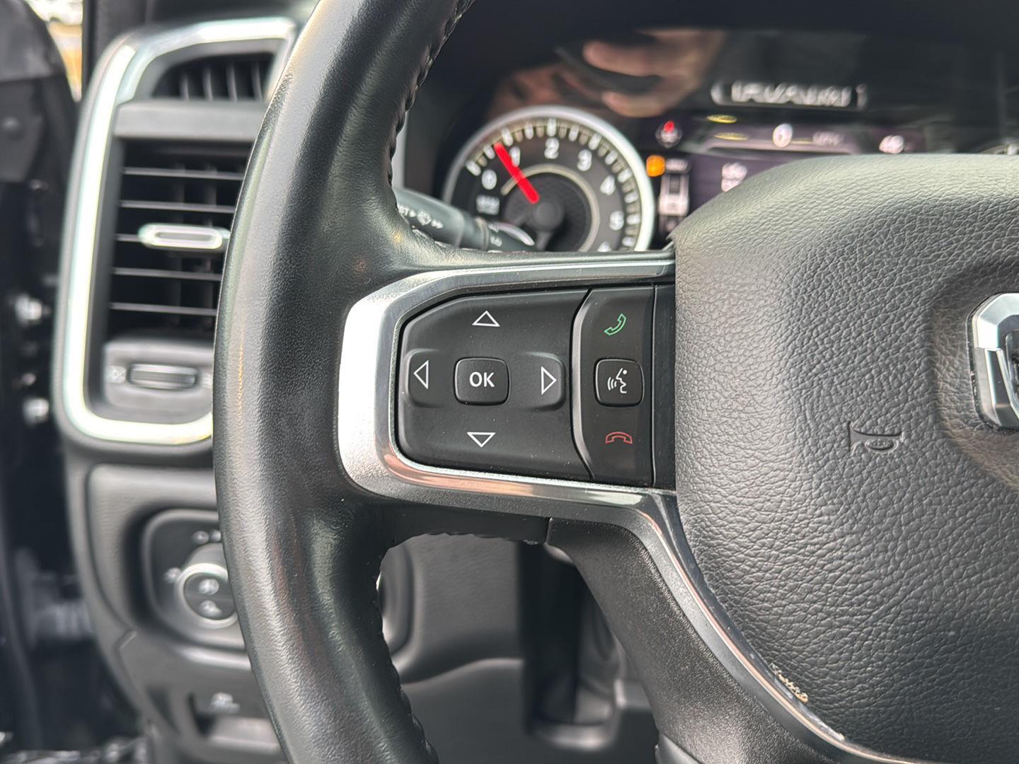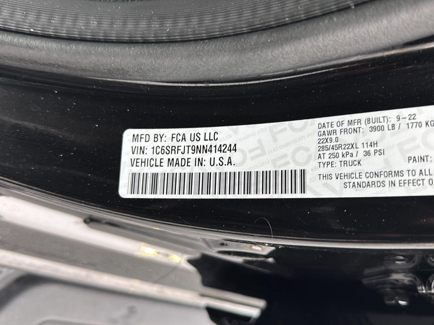 ENGINE: 5.7L V8 HEMI MDS VVT ETORQUE, TRANSMISSION: 8-SPEED AUTOMATIC (8HP75), QUICK ORDER PACKAGE 27H LARAMIE, 3.21 REAR AXLE RATIO, WHEELS: 22 X 9 FORGED ALUMINUM, TIRES: 285/45R22XL BSW ALL SEASON, DIAMOND BLACK CRYSTAL PEARLCOAT, BLACK, LEATHER TRIMMED BUCKET SEATS, GVWR: 7,100 LBS, NIGHT EDITION, LARAMIE LEVEL II EQUIPMENT GROUP, BED UTILITY GROUP, ANTI-SPIN DIFFERENTIAL REAR AXLE, 33 GALLON FUEL TANK, FRONT LICENSE PLATE BRACKET, PICK-UP BOX LIGHTING, RADIO: UCONNECT 5 NAV W/8.4 DISPLAY, MOPAR FRONT & REAR RUBBER FLOOR MATS, PARKSENSE FRONT/REAR PARK ASSIST W/STOP