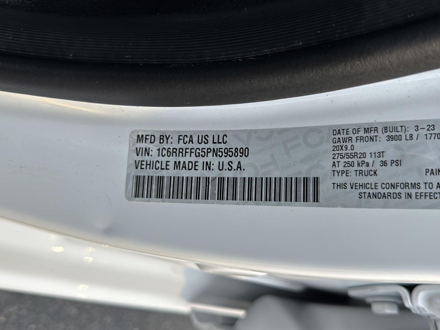 ENGINE: 3.6L V6 24V VVT ETORQUE UPG I, TRANSMISSION: 8-SPEED AUTOMATIC (850RE), QUICK ORDER PACKAGE 23Z BIG HORN, 3.21 REAR AXLE RATIO, WHEELS: 20 X 9.0 PREMIUM PAINT/POLISHED, TIRES: 275/55R20 OWL ALL SEASON, MONOTONE PAINT, BRIGHT WHITE CLEARCOAT, BLACK, DELUXE CLOTH BUCKET SEATS, GVWR: 6,900 LBS, BIG HORN LEVEL B EQUIPMENT GROUP, NIGHT EDITION, ANTI-SPIN DIFFERENTIAL REAR AXLE, RADIO: UCONNECT 5 NAV W/12.0 DISPLAY, 9 AMPLIFIED SPEAKERS W/SUBWOOFER, REMOTE START SYSTEM, MOPAR FRONT & REAR RUBBER FLOOR MATS, PARKSENSE FRONT/REAR PARK ASSIST W/STOP, MANUFACTURER'S STATEMENT OF ORIGIN, 115V AUXILIARY POWER OUTLET