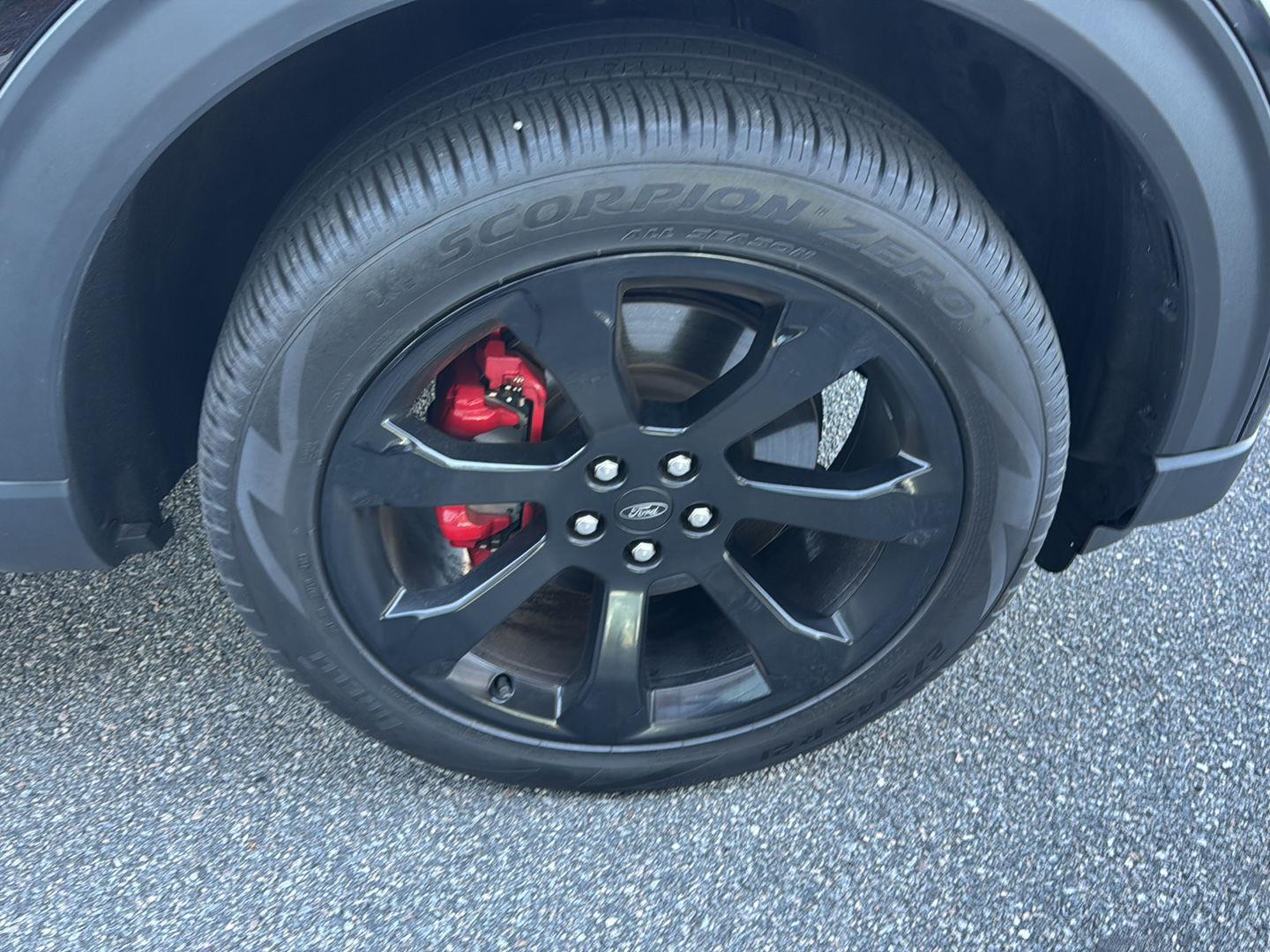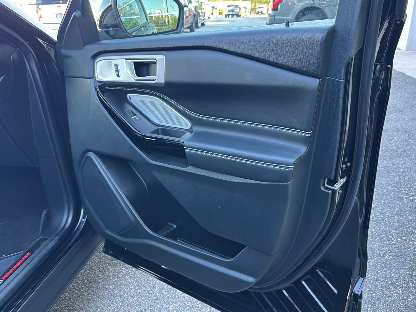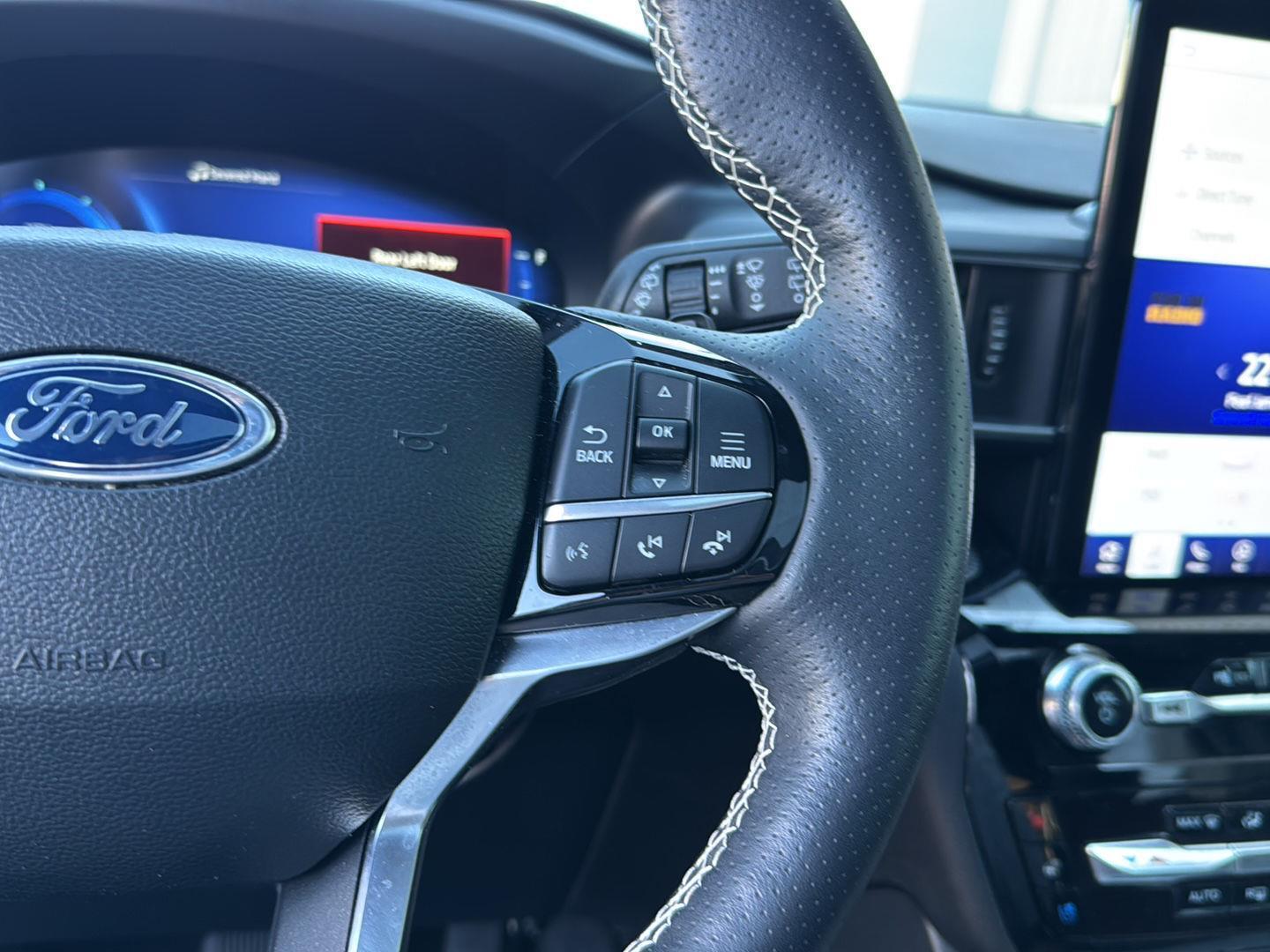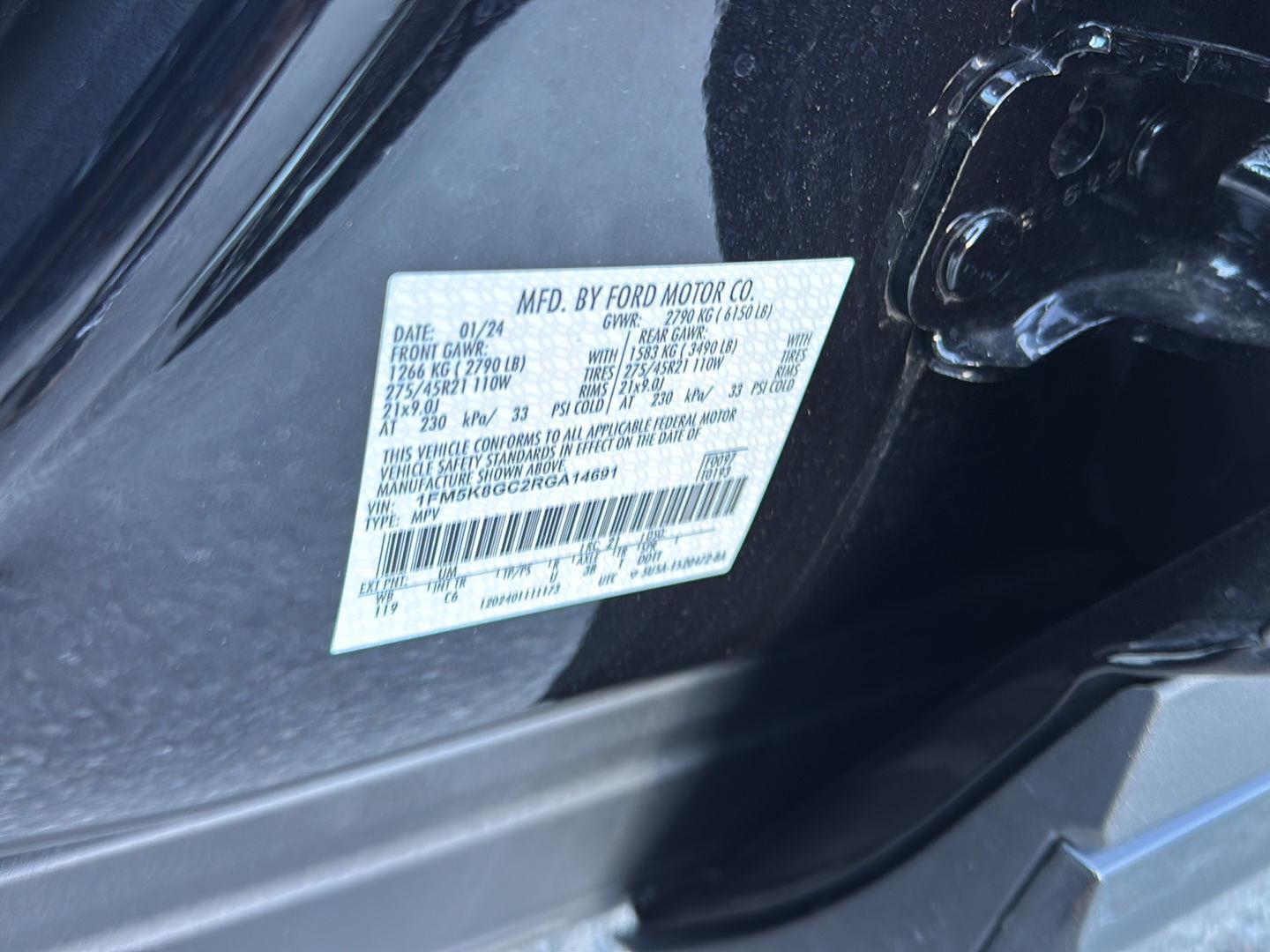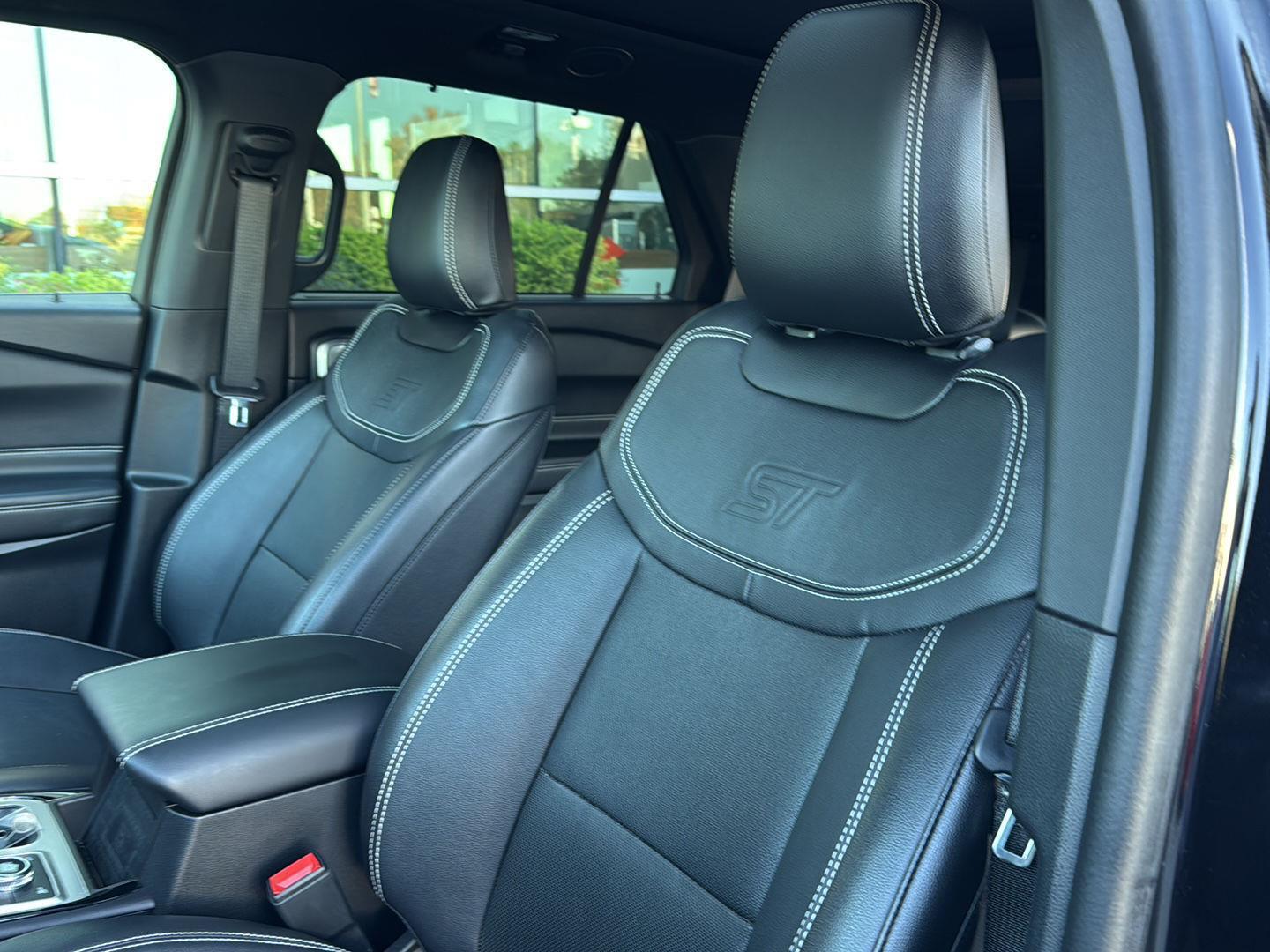 - Includes vehicle with standard equipment, 110V/150W AC power outlet in rear side of center console, 360-degree camera with split view, ambient lighting, auto-dimming rearview mirror, B&O sound system by Bang & Olufsen with 12 speakers including subwoofer, forward sensing system, HD radio, driver's seat memory, power adjustable and power-folding heated sideview mirrors with Autofold, LED turn signal indicators, ST projection lamps, driver's side auto-dimming, driver/passenger side memory, gloss black caps, rain-sensing wipers, reverse brake assist, front heated and ventilated seats, leather seating surfaces with micro-perforated inserts and City Silver accent stitching with ST logo, second row heated seats, second row E-Z entry, third row PowerFold, power tilt/telescoping steering column, universal garage door opener, wireless charging pad, Ford Co-Pilot360 Assist+, adaptive cruise control with stop-and-go, lane centering, evasive steering assist, voice-activated touchscreen navigation system with pinch-to-zoom capability, SiriusXM Traffic and Travel Link, speed sign recognition, 21 in. aluminum wheels with 275/45R21 all-season tires, and performance brakes with red brake calipers.
