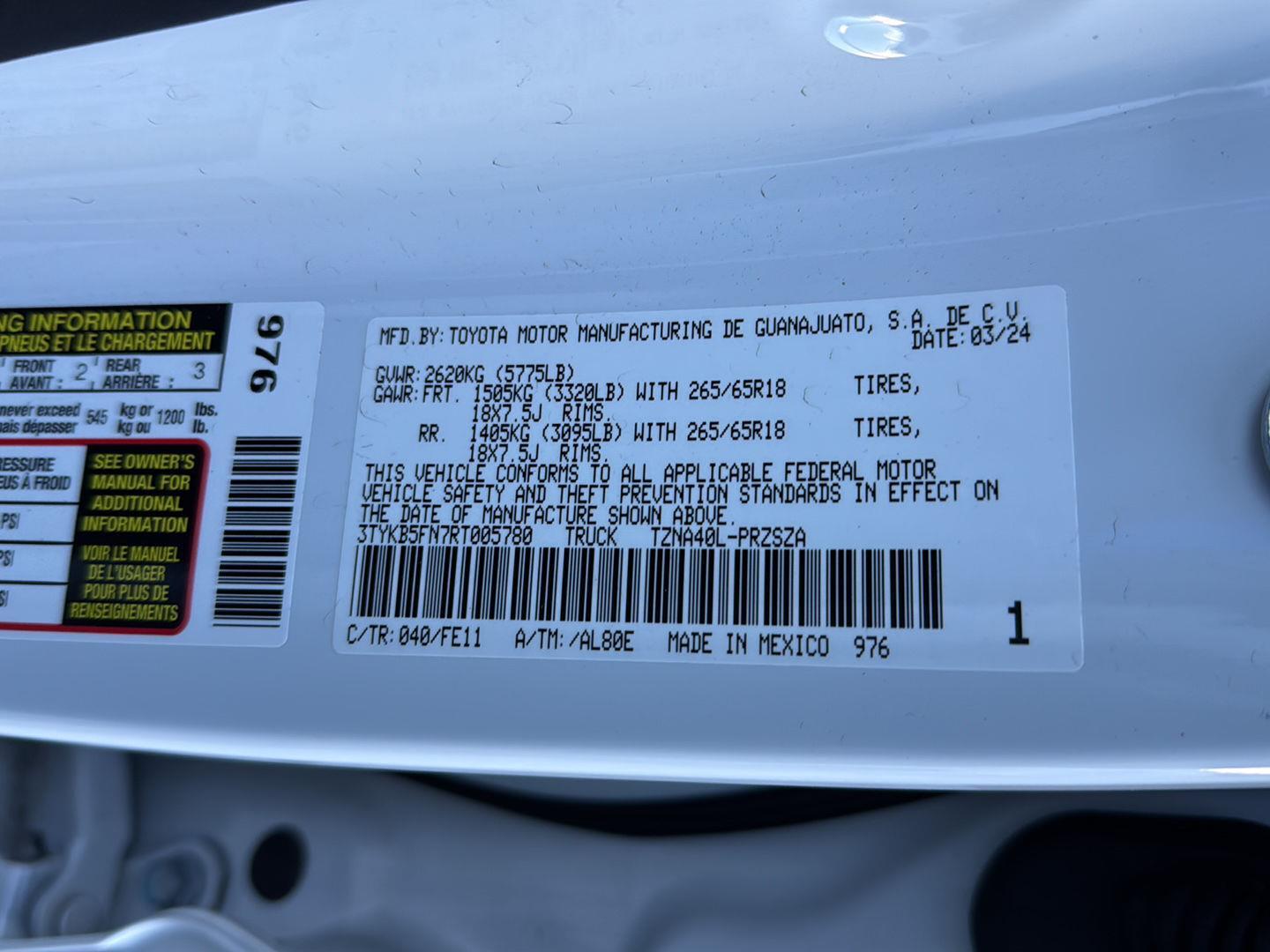 - 18 x 7.5-inch front and rear machined w/painted accents TRD aluminum wheels