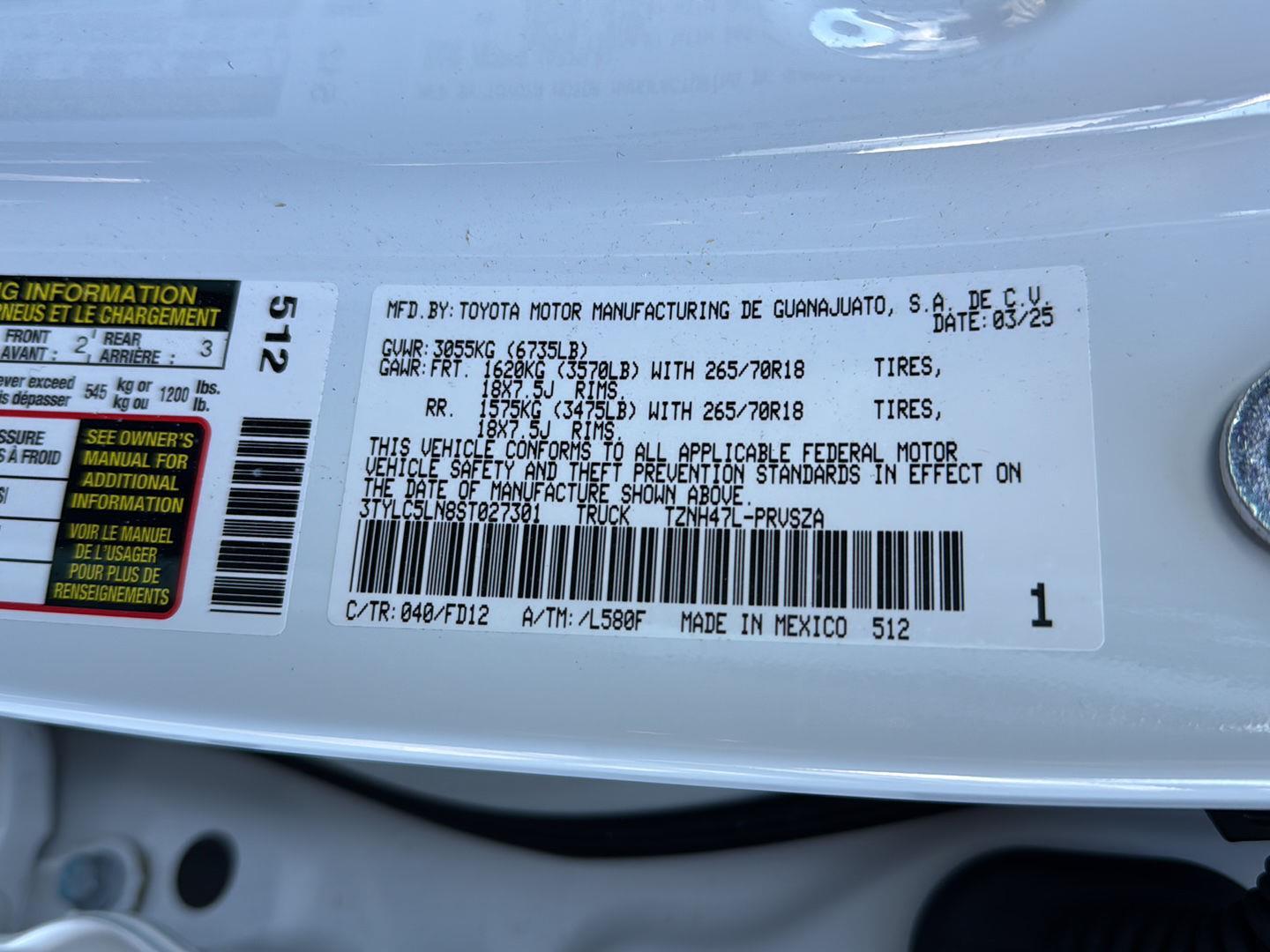 - 18 x 7.5-inch front and rear machined w/painted accents TRD aluminum wheels